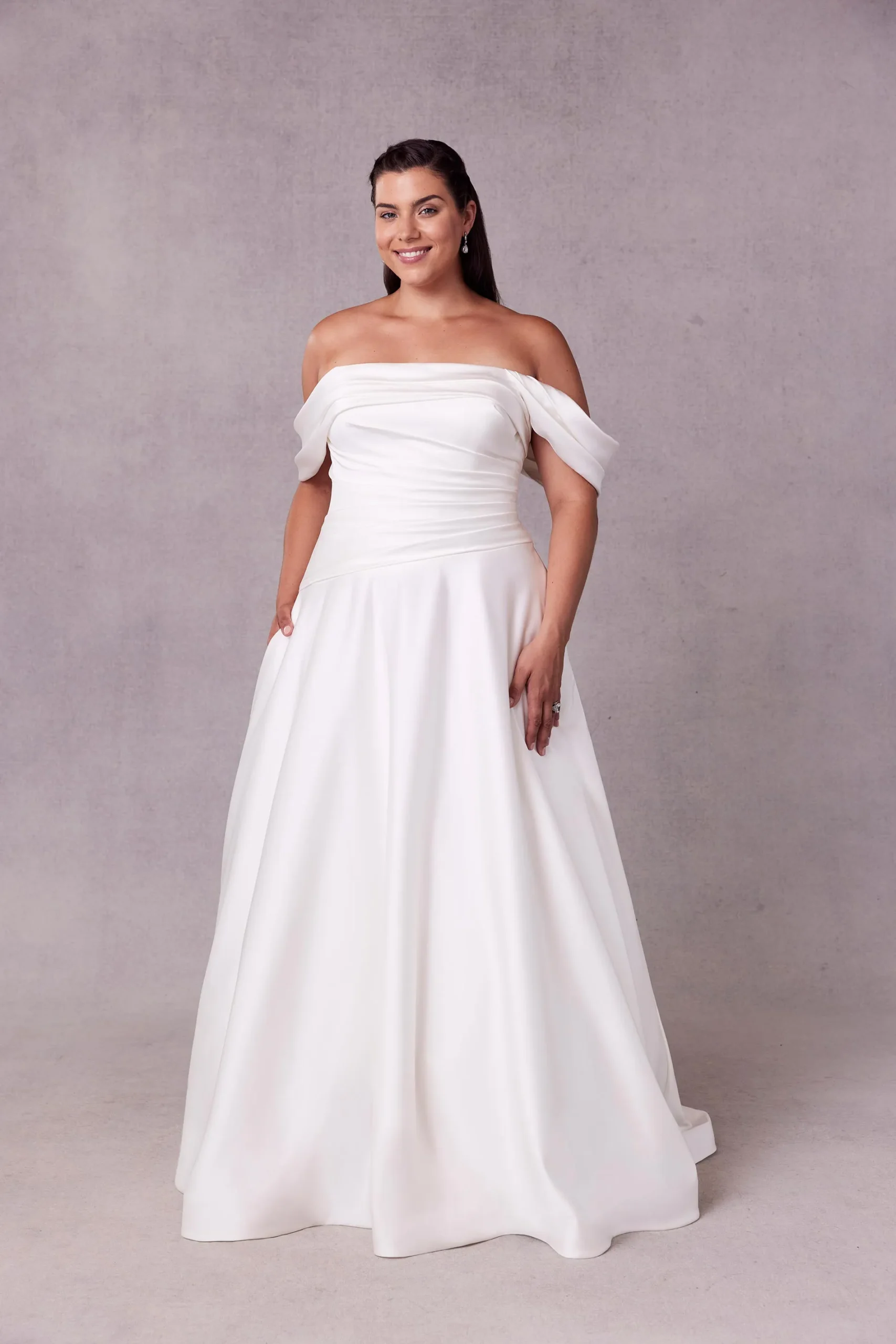 Understated satin wedding dress has an off-the-shoulder neckline with an asymmetrically draped bodice and waist on an A-line silhouette with a corset tie back.