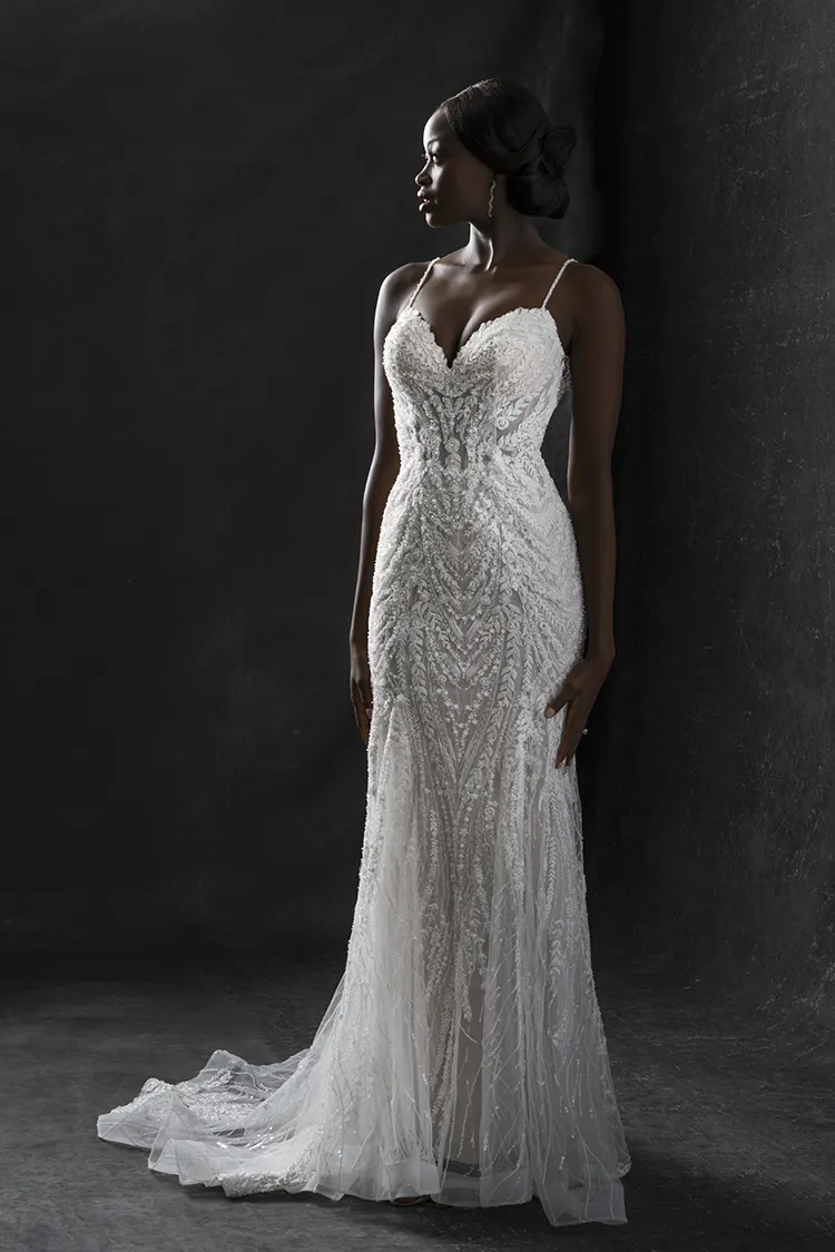 Inspired by the opulence of the Roaring Twenties, this glamorous bridal sheath gown dazzles with intricate beadwork, featuring sparkling crystals, shimmering sequins, and radiant pearls for a truly luxurious look.