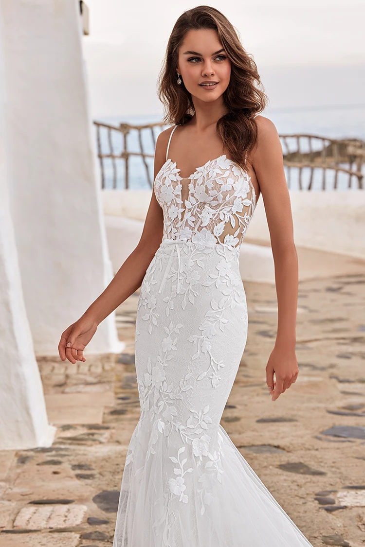 The DION gown is an absolute stunner. With intricate floral embroidered lace and sweet Chantilly lace detailing gracefully wrapping around the bodice and extending into a dramatic tulle mermaid skirt, this gown embodies timeless elegance and feminine allure. A plunging, illusion sweetheart neckline and delicate bow detail at the waist further enhance and flatter the figure