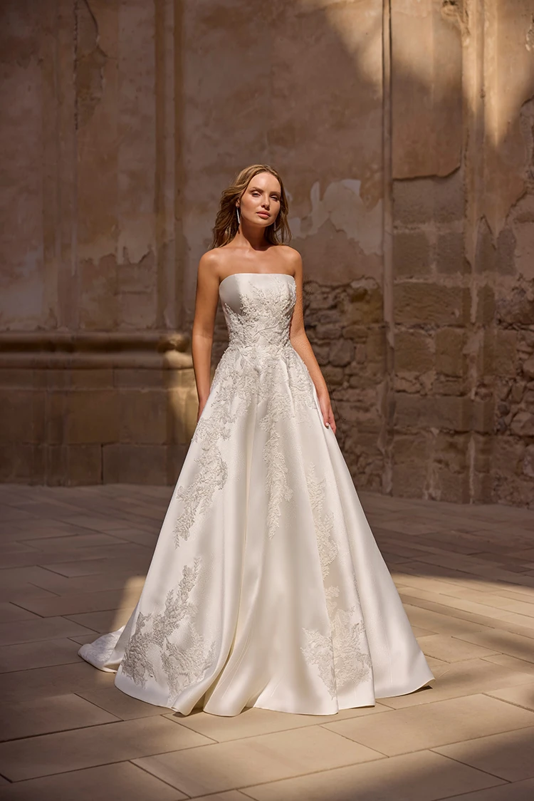 This timeless strapless Mikado ballgown combines elegance and charm. Beaded lace appliqués adorn the bodice and skirt, adding a touch of sparkle and sophistication to the chic silhouette. A perfect choice for a classic and refined bridal look.