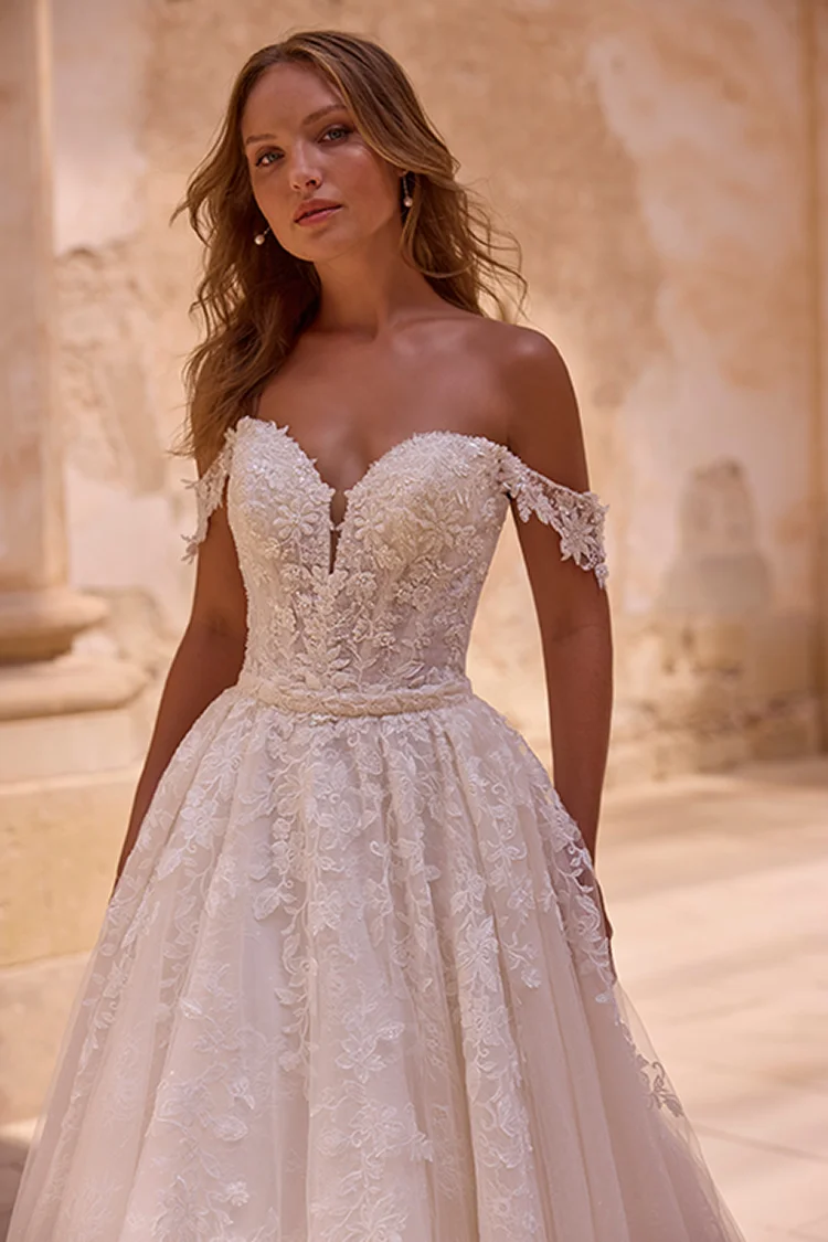 This laced ballgown wedding dress exudes romance with botanical appliqués and an off-the-shoulder sweetheart neckline. Sheer back panels add a touch of allure, making it a perfect blend of elegance and femininity.