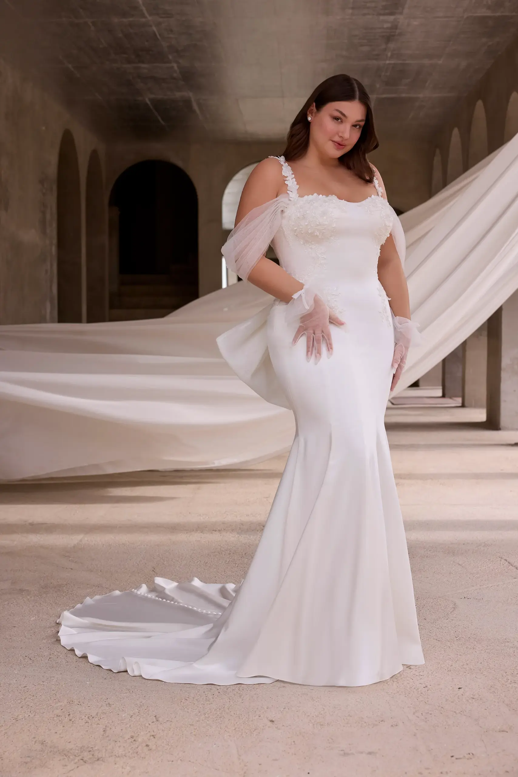 Silky satin mermaid wedding dress has a modified sweetheart neckline with detachable organza drapes and 3D floral and crystal embroidered straps with a detachable bow.