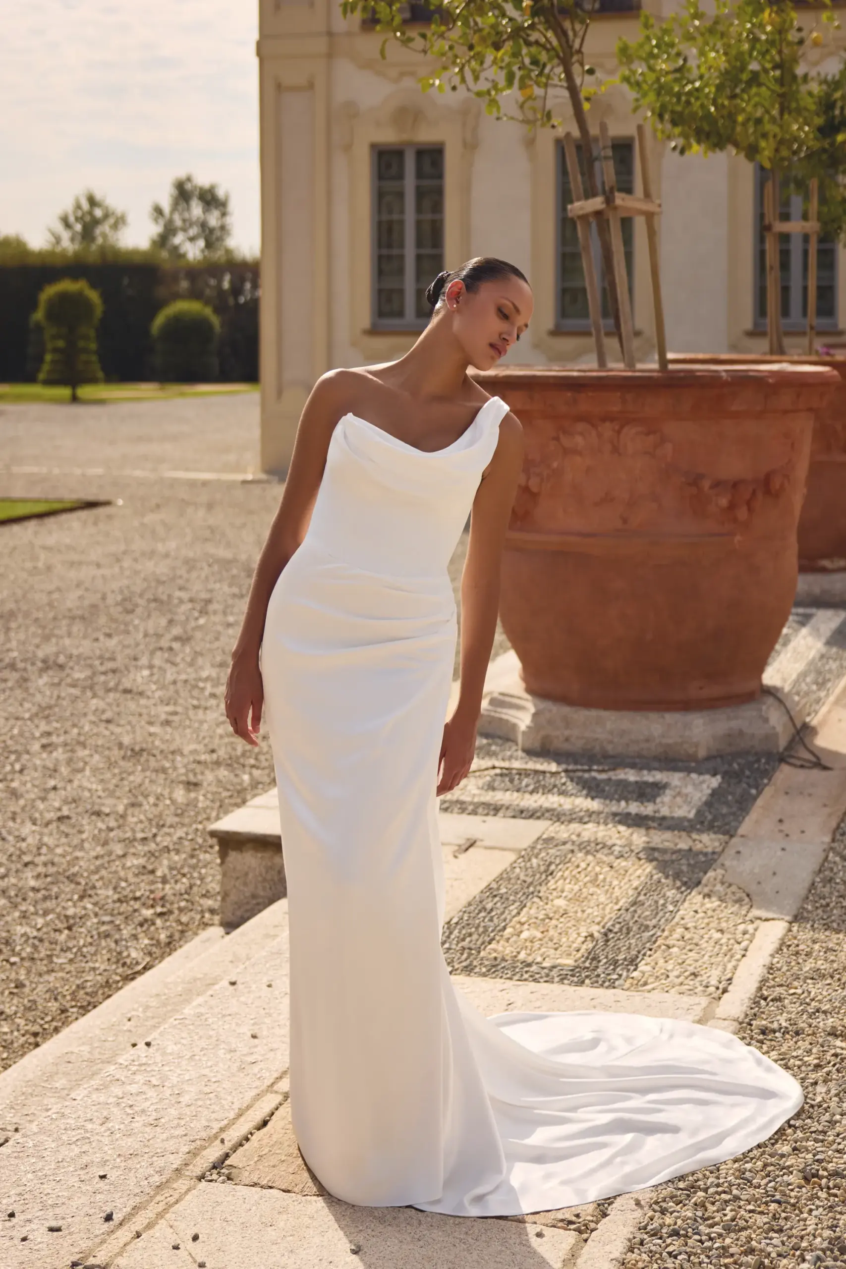 Inroducing Knox, a clean charmeuse fit and flare gown with a draped one shoulder neckline. Draping continues onto back neckline with pleated detail. Bodice features corset boning structure with a basque waist. Skirt has draped details on the front and has pleating across the back. Finished with buttons down to the inivisible zip closure. Trails into a chapel length train.
