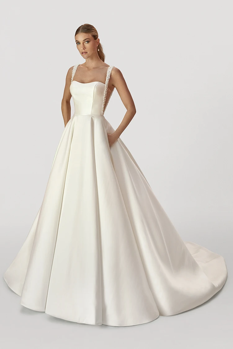 The ethereal beauty of the Gracie gown can be found in its botanical lace appliques, soft A-line tulle and tonal beadwork.