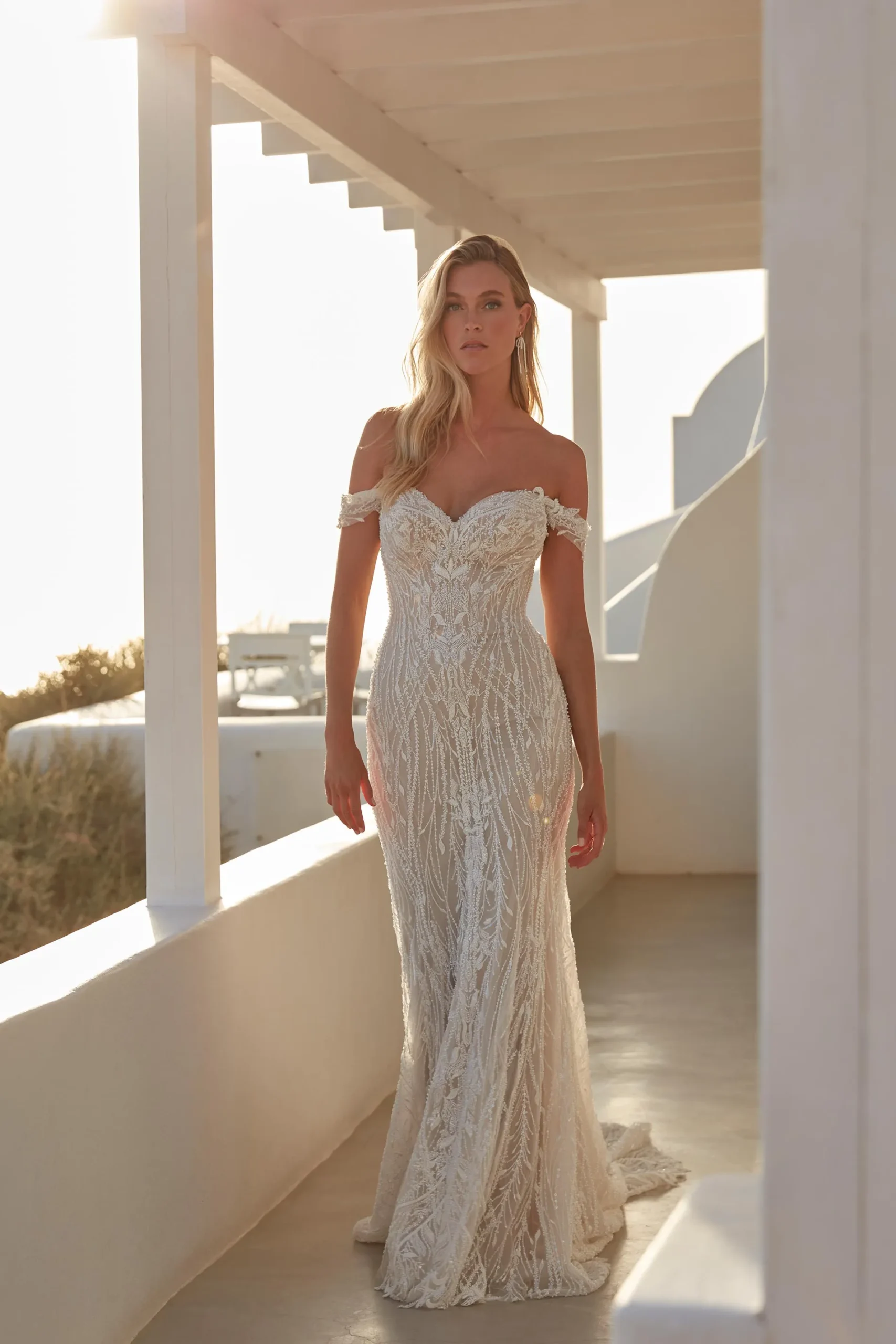 Introducing Flavia: an opulent off-shoulder sheath gown embellished with beaded, sequined and pearl lace appliques.
