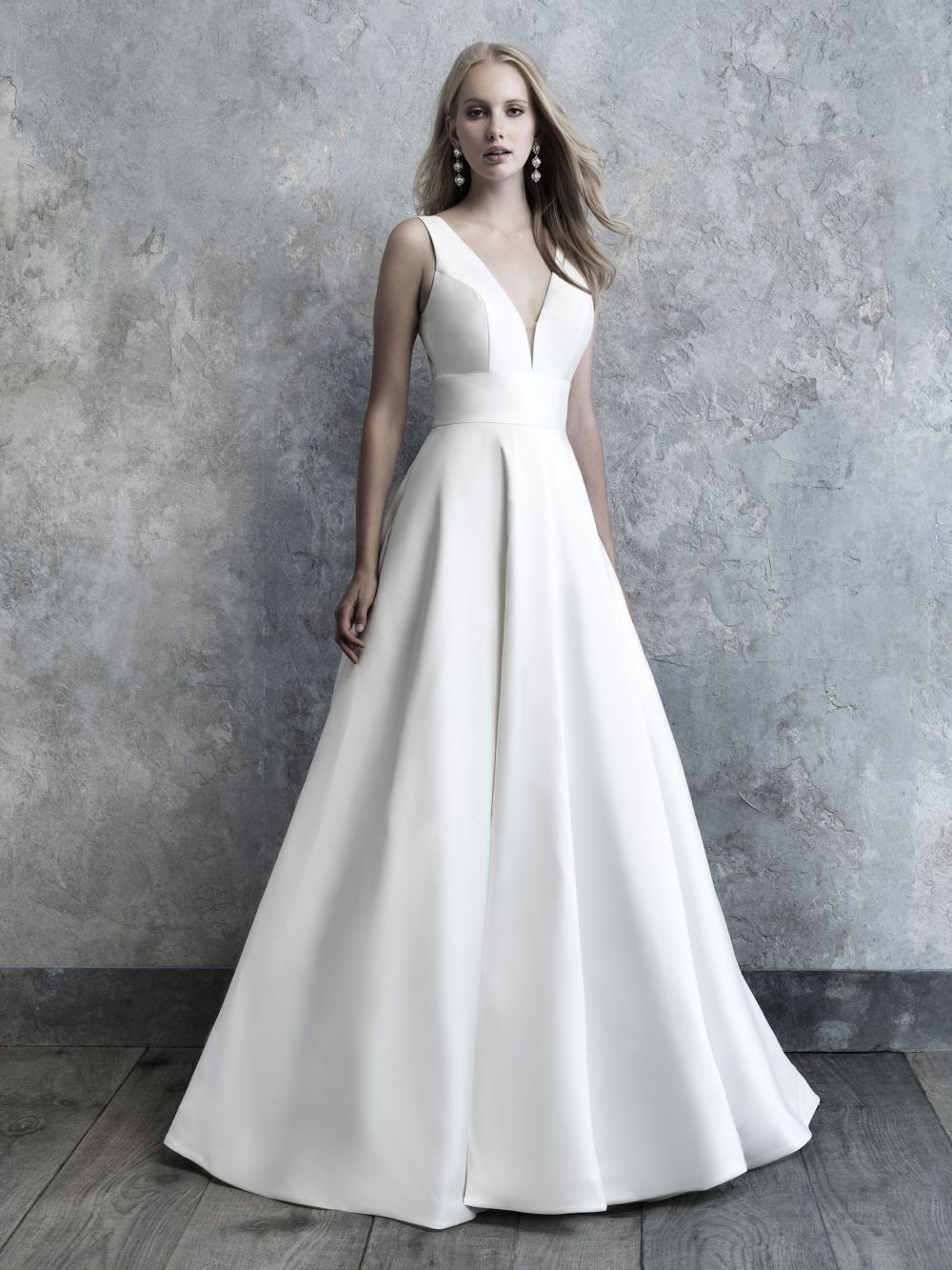 Timeless soft Mikado is covered in nothing more than an endless row of elegant buttons down the train.