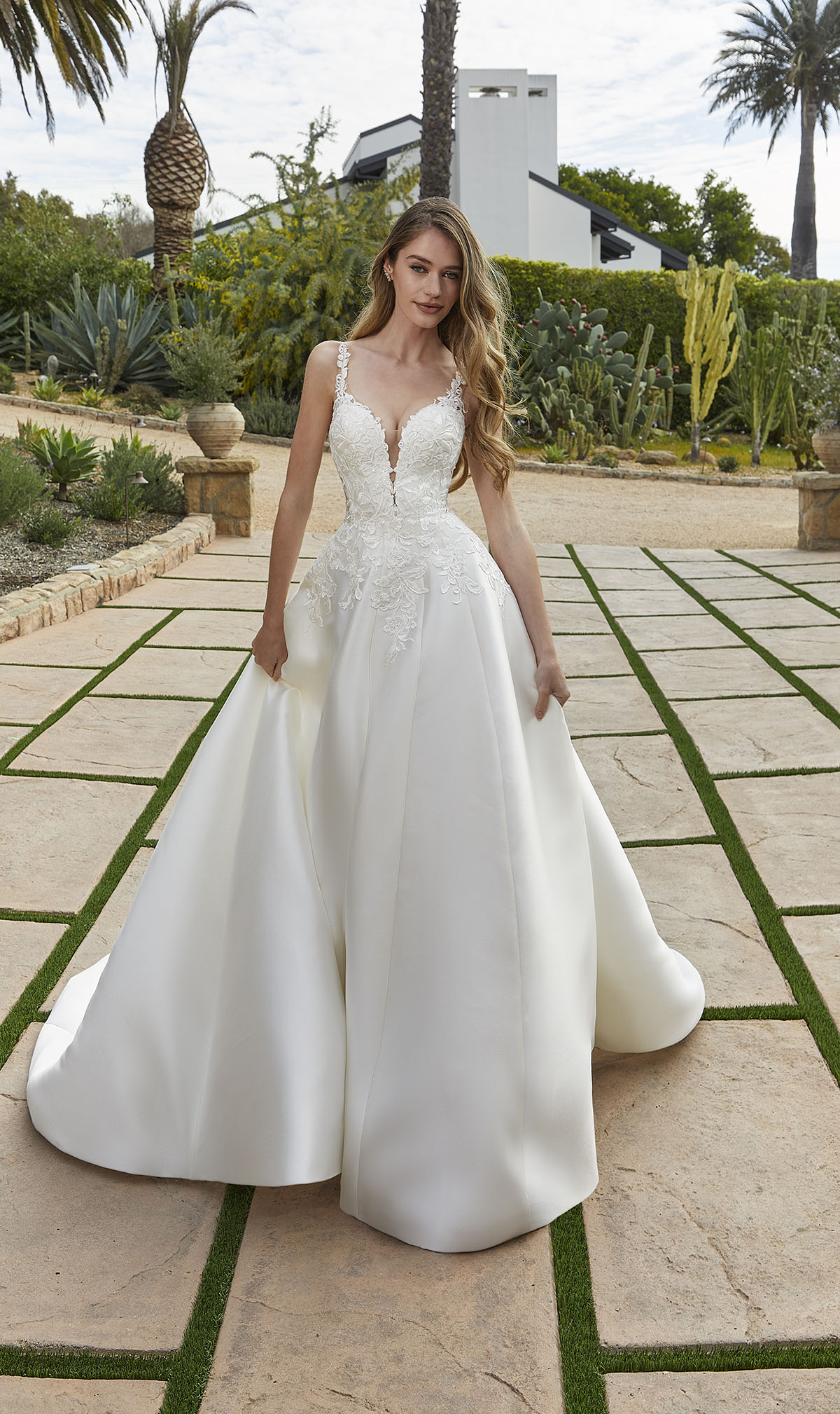 Elegant silky Larissa satin ball gown has romantic frosted lace appliqués on a plunging sweetheart bodice.