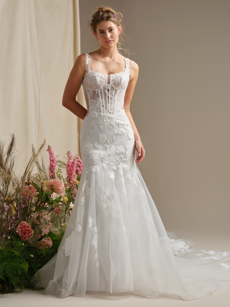 Delicate plunging square neckline, illusion bodice, fit and flare wedding gown.