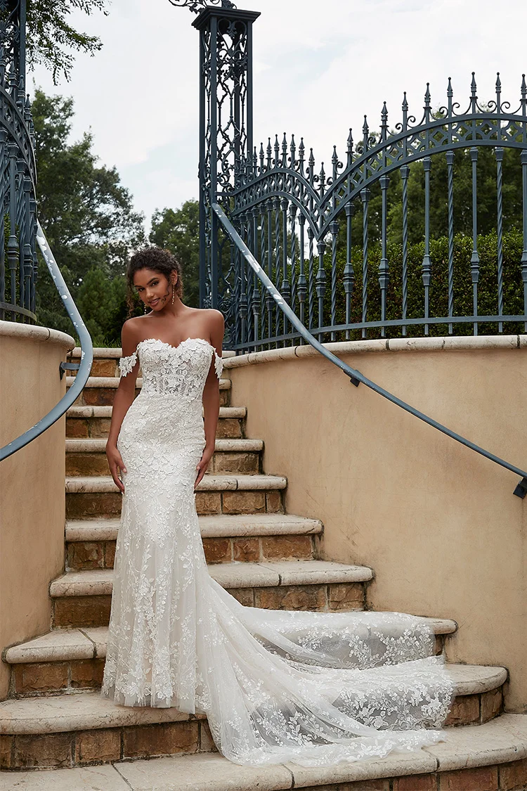 Magical mermaid has delicately beaded, allover 3D floral embroidery over sparkle tulle with a corset bodice and detachable sleeves.