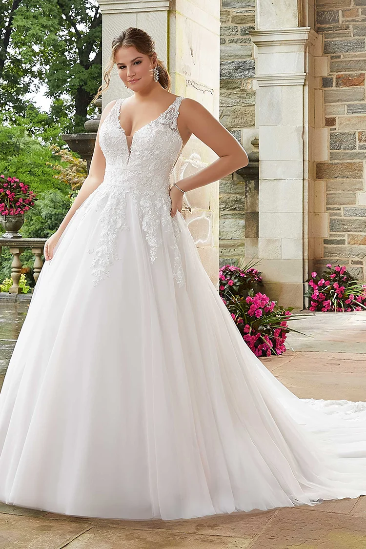 Classic ball gown has pearl and crystal beaded embroidered appliqués with a plunging neckline and double banded waist on an A-line skirt.