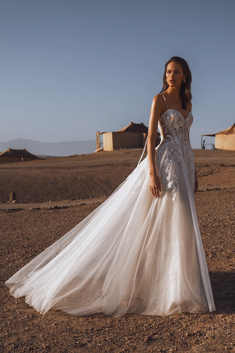 Channel modern romance in this chiffon floral embroidered lace A-line gown, featuring a sweetheart neckline and bow detailed straps that dreamily flow from the back for a contemporary twist to the classic silhouette, perfect for the bride who wants to make a statement on her special day. Exquisite beaded swirl lace embellishes the top of the soft tulle and glitter tulle skirt for extra, gorgeous sparkle.