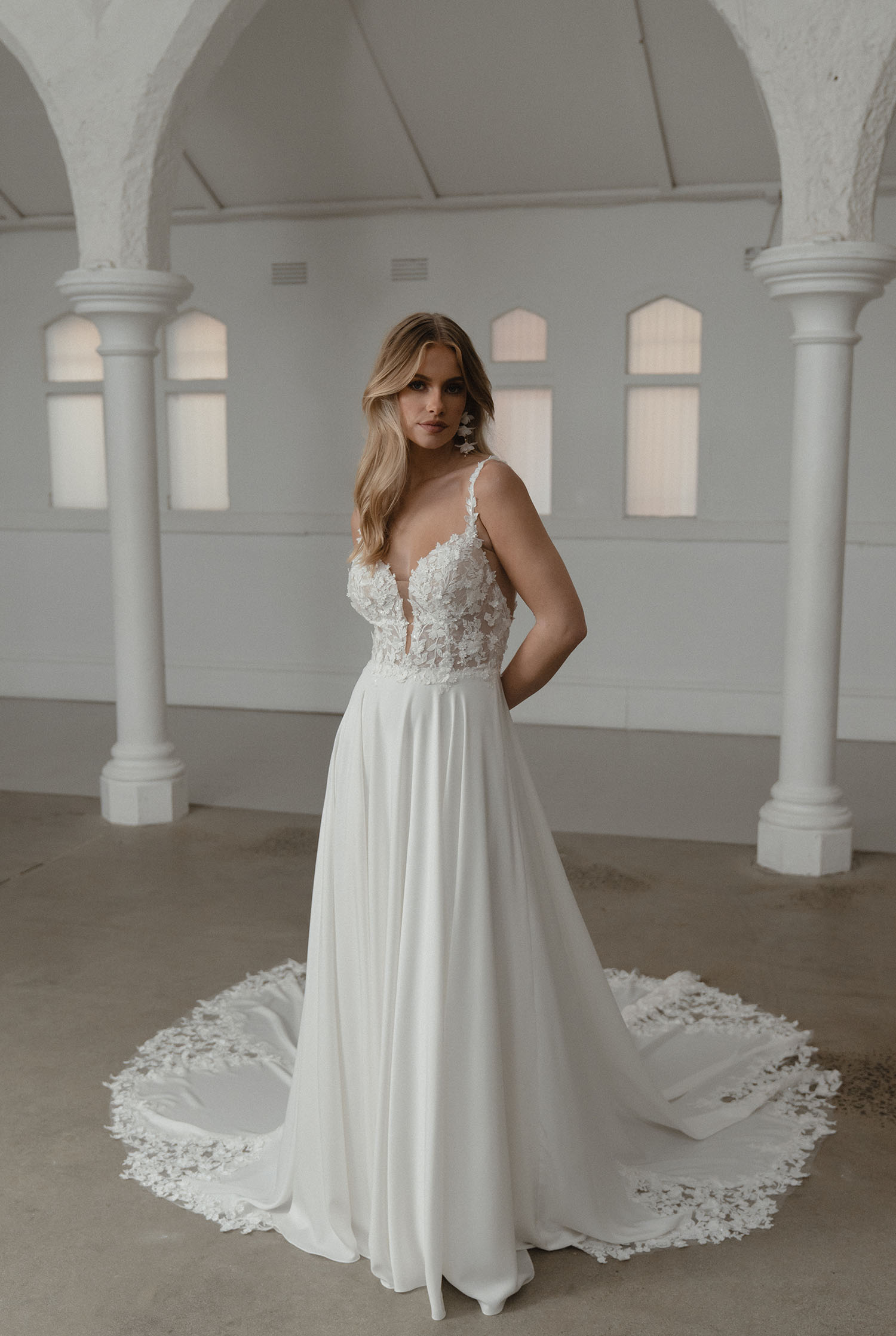 Unveil the epitome of minimalist elegance with Somerset, our stunning wedding dress from the ‘Memoirs: The Epilogue’ collection. Celebrating the contemporary bride’s love for simplicity, this A-line gown features European buttery crepe, luxurious satins, and organza adorned with delicate lace accents. Somerset’s floral lace bodice and stretch satin blend modernity with timeless charm, while the low scoop back, signature boning construction, and plunge sweetheart neckline add allure to her understated beauty. The circle skirt with soft pleating and cutout lace train bestows an enchanting movement, leaving a lasting impression on all who bear witness. Embrace the art of elegant simplicity with Somerset, a masterpiece designed for the modern minimalist bride.