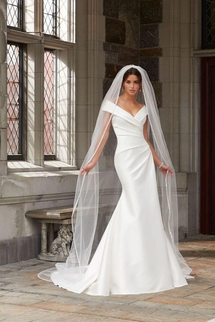 The Stacey wedding gown features draped, stretch Larissa satin in a fit to flare silhouette.