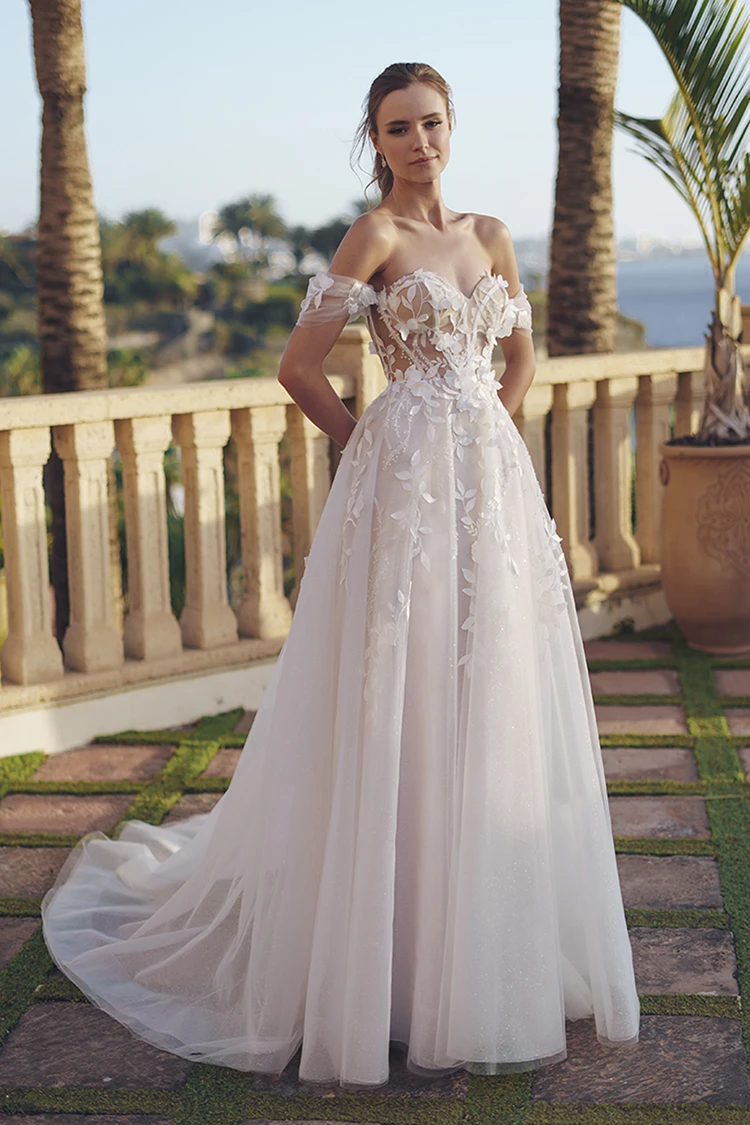 Exude femininity in SURI, a romantic A-line wedding dress where the intricately beaded swirl lace, classic sweetheart neckline, and 3D Mikado floral appliques create a soft and romantic aesthetic, while the flowing skirt crafted from layers of soft tulle and glitter tulle adds movement and flair, ensuring you feel like a vision of bridal beauty on the big day. Dreamy, detachable off-the-shoulder tulle straps further enhance the elegance of the illusion corset-style bodice.