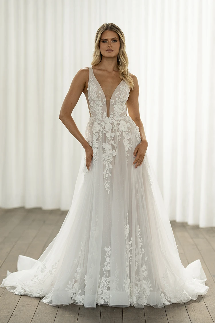 A key centrepiece of our Madi Lane Ceres collection is our Tatiana lace wedding dress with her plunging V-neckline, sheer illusion tulle sides, and low scooped back.