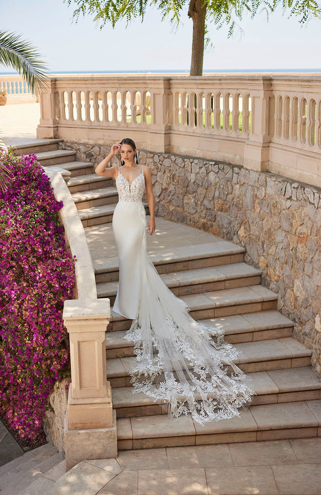 Exude elegance in this simple lace, sleek dress, detailed in exquisite floral and vine lace appliques on the bodice and an illusion open back. For an extra dramatic flair this dress comes with a sheer lace train.