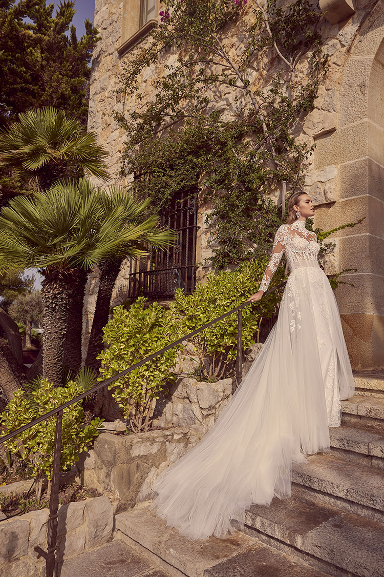 This beautiful modern twist on a traditional wedding dress is sure to turn heads. With a stunning illusion high neck bodice, pleated sheer waistband, long sleeves and a breathtaking sheer illusion back