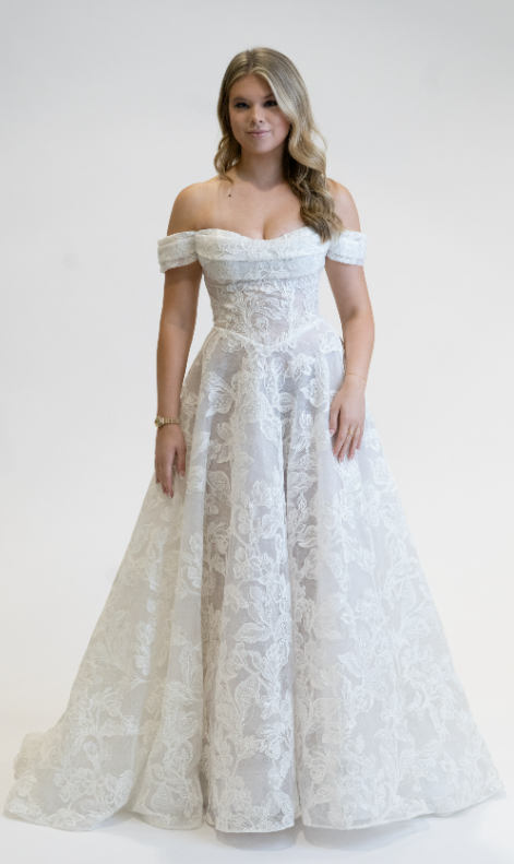 An elegant off-the-shoulder bridal gown featuring a structured lace bodice with a flattering sweetheart neckline. The fitted waist flows into a full A-line skirt adorned with delicate floral lace, creating a timeless and romantic silhouette perfect for a classic wedding day.